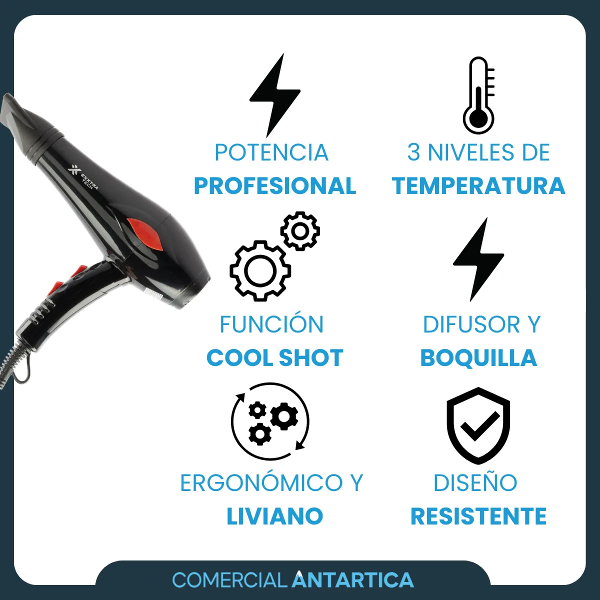 Secador De Pelo Cabello 2 Velocidades HNova Extra Techh 3 graduaciones de temperatura y 2 escalas de ventilacion Cool shot difusor profesional boquilla de moldear Anilla de colgar abastecimiento de corriente electrica Marca: Extra Techh ¡Potencia y estilo se unen en el Secador de Pelo Hnova ET10100 de 2000W! Diseñado para proporcionarte un secado rápido y eficiente mientras cuidas de tu cabello, este secador ofrece un rendimiento excepcional para ayudarte a lucir tu mejor look todos los días. Con su potente motor de 2000W, este secador ofrece un flujo de aire potente que te permite secar tu cabello en menos tiempo, ahorrándote tiempo y esfuerzo por la mañana o antes de salir por la noche. Ya sea que tengas el cabello grueso y rizado o fino y lacio, este secador ofrece el calor y la potencia necesarios para obtener resultados profesionales en casa. Sus múltiples ajustes de temperatura y velocidad te permiten personalizar tu experiencia de secado según tu tipo de cabello y preferencias individuales. Desde un flujo de aire suave y fresco hasta una ráfaga de calor intenso, este secador te ofrece la flexibilidad que necesitas para obtener el estilo perfecto cada vez. Además, su diseño ergonómico y liviano hace que sea cómodo de sostener y manejar durante todo el proceso de secado, reduciendo la fatiga de la mano y el brazo. Su tecnología avanzada de reducción de ruido también asegura una experiencia de secado más tranquila, lo que te permite disfrutar de un momento de tranquilidad mientras te arreglas. Ya sea que estés buscando un secador potente para tu rutina diaria o un aliado confiable para tus aventuras de viaje, el Secador de Pelo Hnova ET10101 de 2000W es la elección perfecta para obtener resultados profesionales desde la comodidad de tu hogar. ¡Hazte con el tuyo hoy y descubre el secreto de un cabello hermoso y bien cuidado en cada secado!