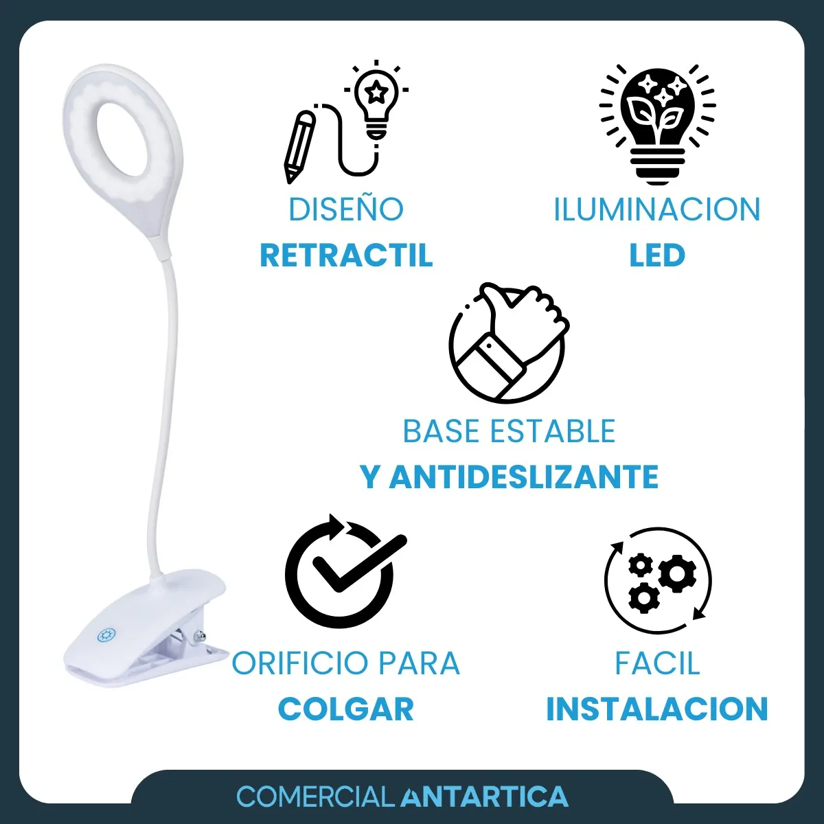 Esta lámpara de escritorio combina diseño moderno, funcionalidad y tecnología avanzada para adaptarse a tus necesidades de iluminación en el hogar, oficina o espacio de estudio. Su diseño inalámbrico y control táctil la convierten en una solución práctica y elegante para cualquier ambiente. Características principales: Control táctil: Permite encender, apagar y ajustar la intensidad de la luz con un simple toque, proporcionando una experiencia intuitiva y moderna. Luz LED de bajo consumo: Proporciona iluminación uniforme y sin parpadeos, ideal para estudiar, trabajar o leer sin causar fatiga visual. Diseño flexible: Su cuello ajustable permite dirigir la luz a diferentes ángulos, adaptándose a tus necesidades. Función inalámbrica: Equipado con una batería recargable que permite usarla sin cables, ofreciendo total portabilidad. Puerto USB: Ideal para cargar dispositivos electrónicos como teléfonos o tablets directamente desde la lámpara. Ventajas: Eficiencia energética: La tecnología LED consume menos energía y tiene una mayor durabilidad en comparación con las bombillas tradicionales. Portabilidad: Su diseño inalámbrico y ligero permite transportarla fácilmente a cualquier lugar. Versatilidad: Perfecta como lámpara de escritorio, luz de lectura o lámpara auxiliar para diferentes espacios. Estilo moderno: Diseño minimalista que complementa cualquier decoración. Usos recomendados: Iluminación para escritorios de trabajo o estudio. Luz auxiliar para leer en la cama o el sofá. Uso como lámpara decorativa o de ambiente en cualquier habitación. Especificaciones: Tipo de luz: LED. Control: Táctil con ajustes de brillo. Fuente de alimentación: Batería recargable e incluye puerto USB. Diseño: Flexible y portátil. Incluye: Lámpara de escritorio touch inalámbrica. Cable USB para carga. Manual de usuario. Por qué elegir este producto: Esta lámpara combina tecnología avanzada y diseño funcional para ofrecer una solución de iluminación eficiente y práctica. Su portabilidad, facilidad de uso y estilo moderno la convierten en un complemento ideal para cualquier espacio. Haz tu compra ahora y transforma tu espacio con esta lámpara funcional y elegante.